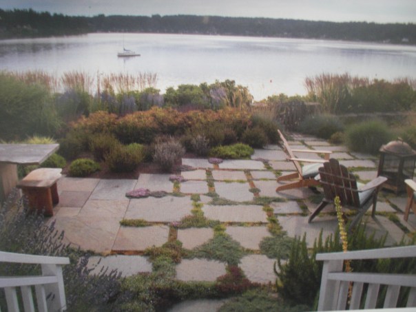 What I like about this picture/garden/patio: 1. the different shapes of the stones 2. the shape of the patio 3. the gaps between the stones 4. the different colors and textures of the ground covers 5. how the patio flows into the garden 6. it looks natural and not cold